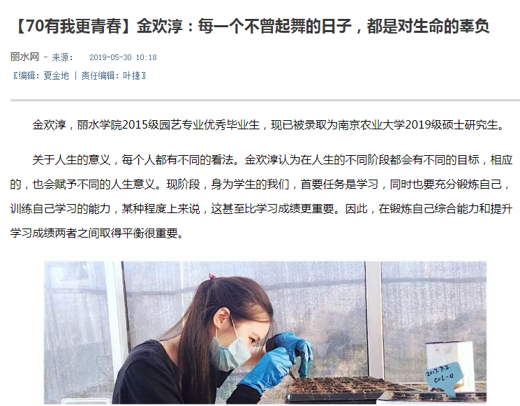 2019年5月30日,丽水日报社主办的丽水网“70有我更青春”新闻专题特别报道栏目报道了我校优秀毕业生金欢淳的故事。
