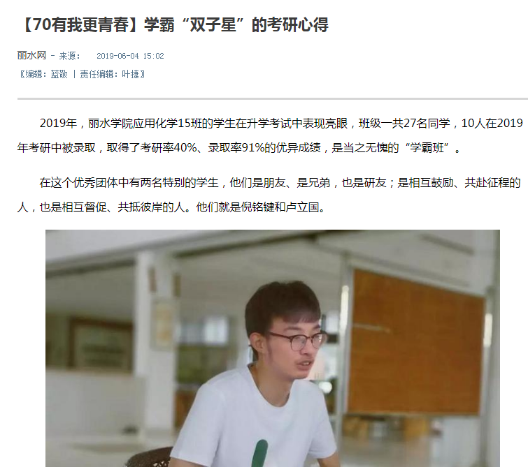 2019年6月4日,丽水日报社主办的丽水网“70有我更青春”新闻专题特别报道栏目报道了我校生态学院应用化学15班考研成绩喜人的消息。