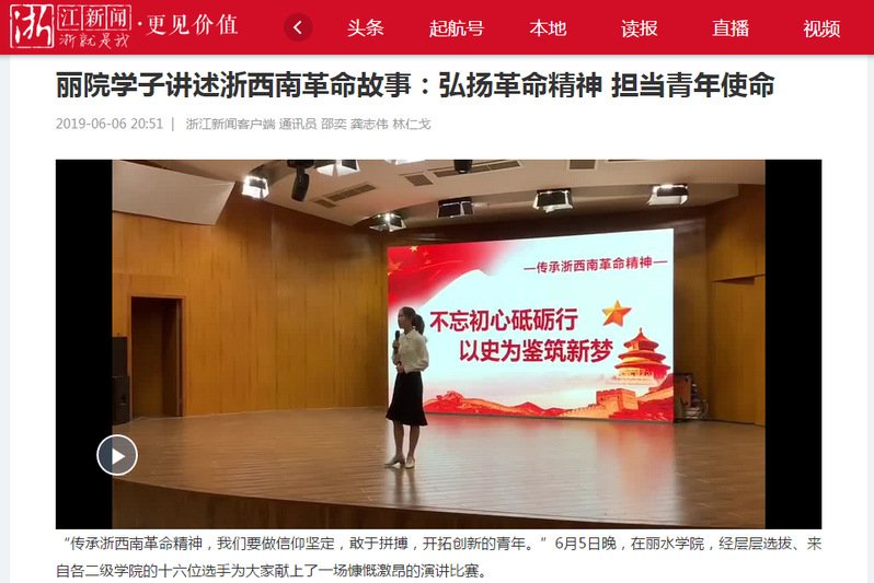 2019年6月6日,浙江日报主办的浙江新闻客户端发布了我校举办“弘扬浙西南革命精神 担当新时代青年使命”思想政治理论课演讲比赛的消息: