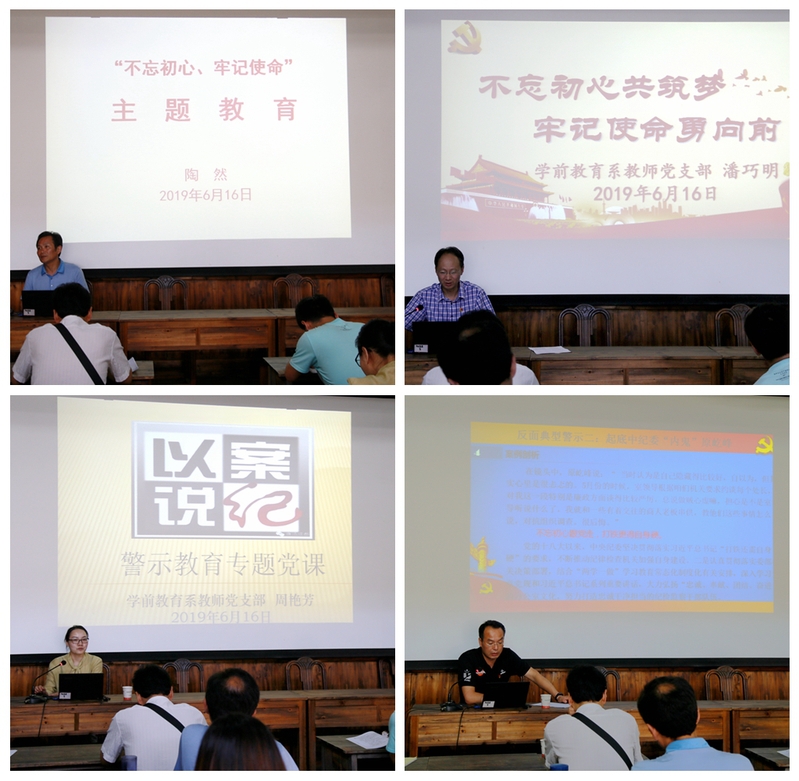 活动中,全体党员在住龙红军学堂(张家宗祠)开展学习了党的地方组织、党支部委员会建设、高校基层党支部建设标准、中国共产党党员教育管理工作条例等内容;学习了习近平总书记在“不忘初心、牢记使命”主题教育工作会议发表重的要讲话的主要精神。陶然、潘巧明、周艳芳、王晓飞同志分别作了《不忘初心、牢记使命》《不忘初心共筑梦,牢记使命勇向前》《以案说纪,警示教育专题党课》《反面典型警示二,起底中纪委“内鬼”原屹峰》为主题的党课。活动还为学前教育系李小花同志过政治生日,并集体重温了入党誓词。