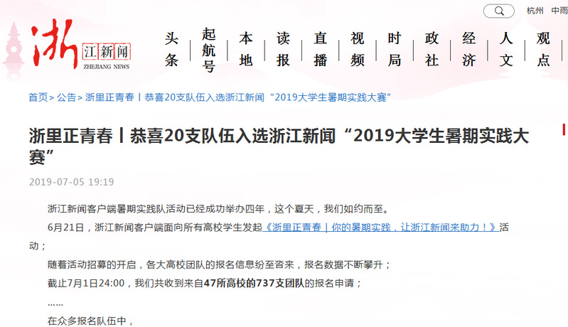 2019年7月5日,浙江新闻客户端公布入选浙江新闻“2019浙里正青春·大学生暑期实践大赛”的20支优秀队伍名单,我校商学院“情系家乡”华侨新生代华文教育夏令营暑期社会实践团队在737支报名队伍中脱颖而出,成为唯一入围的涉侨服务项目。