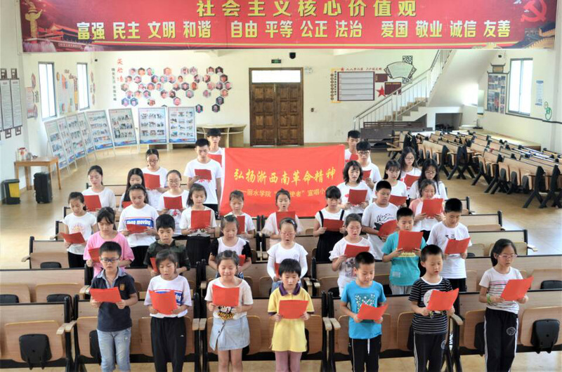 在文化礼堂前,师生们带着饱满的热情,唱响由音乐系杨建伟教授搜集、整理的遂昌当地红歌《送郎歌》和《操练歌》,用歌声表达了对革命先烈的敬仰,唱出了对祖国未来的美好祝愿。