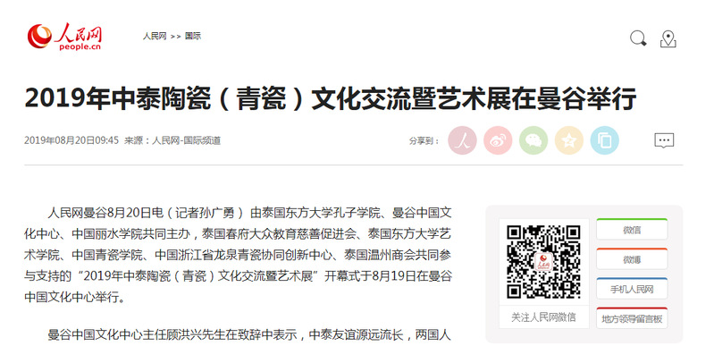 2019年08月20日,人民网国际频道发布了由我校参与和支持的2019年中泰陶瓷(青瓷)文化交流暨艺术展在曼谷举行的消息: