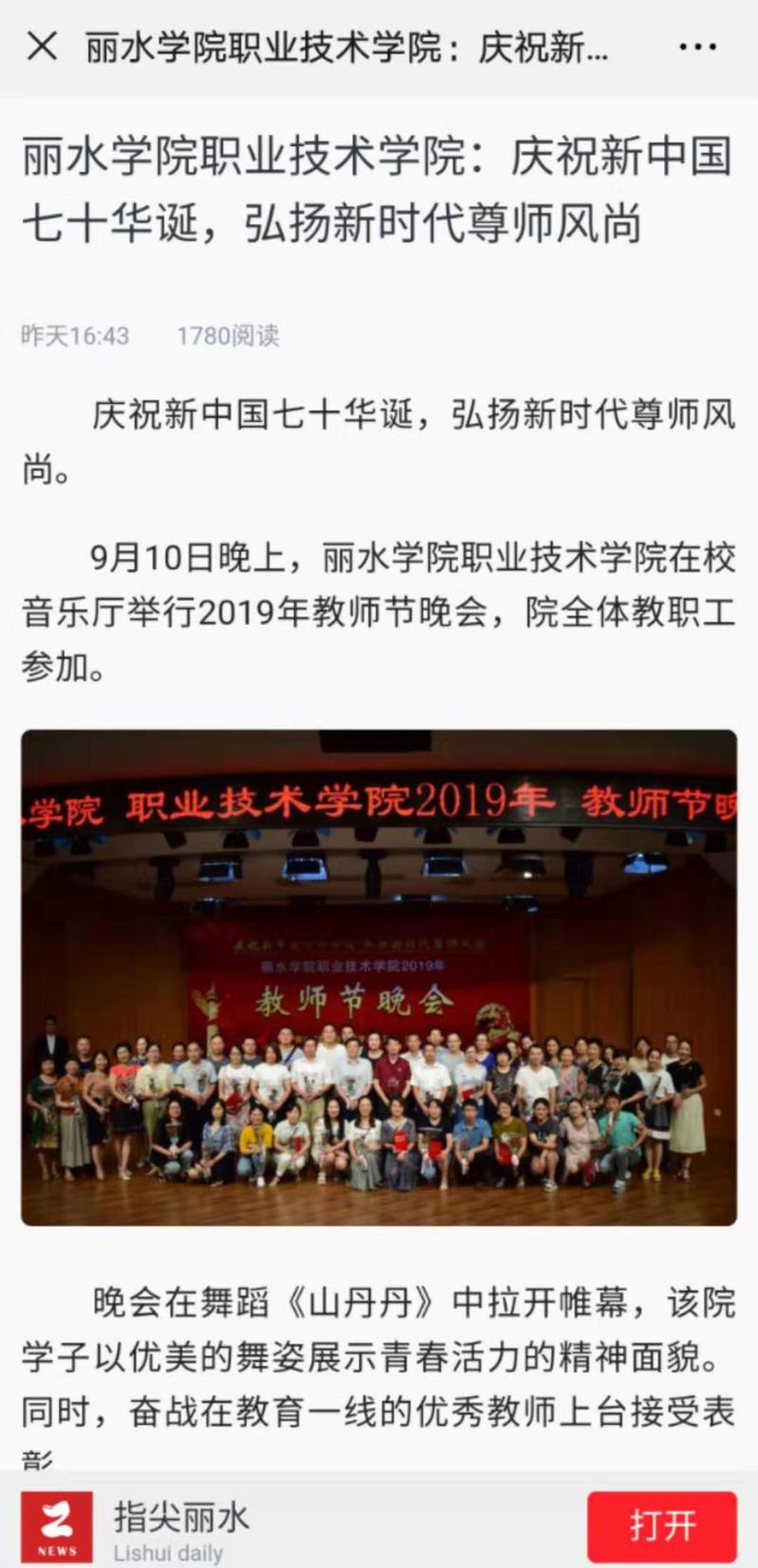 9月11日,丽水日报新闻客户端“指尖丽水”发布了我校职业技术学院举行“庆祝新中国七十华诞,弘扬新时代尊师风尚”教师节晚会的报道。
