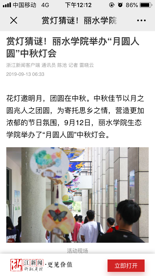 2019年9月13日,浙江新闻客户端发布了我校生态学院举办“月圆人圆”中秋灯会的报道。