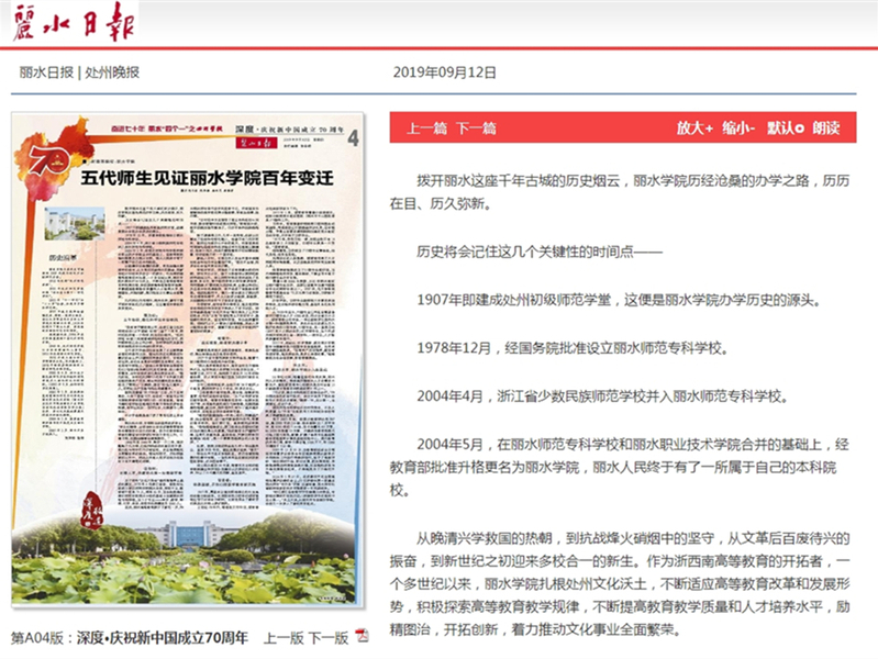 2019年9月12日,丽水日报刊登了《五代师生见证丽水学院百年变迁》的深度报道。