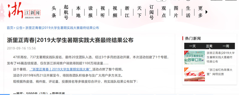 2019年9月16日,浙江新闻公布了浙里正青春|2019大学生暑期实践大赛结果,我校商学院“情系家乡”华侨新生代华文教育夏令营暑期社会实践团队荣获三等奖。