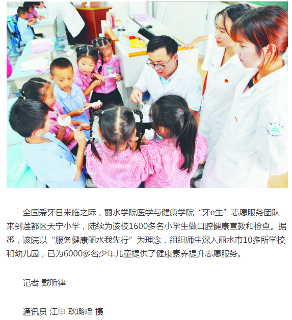 2019年9月23日,丽水日报图片新闻报道了医学与健康学院“牙e生”志愿服务团队为天宁小学1600多名小学生做口腔健康宣教和检查的消息。