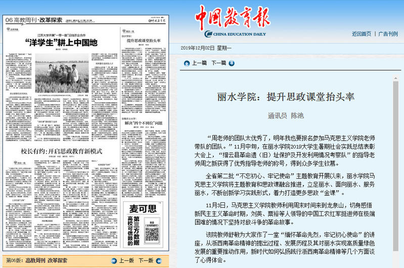 2019月12月2日,中国教育报报道了我校不断创新学习实践形式,着力打造更多思政“金课”的消息。