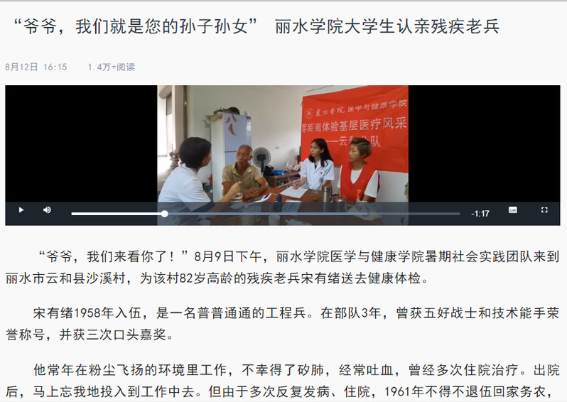 2019年8月12日,丽水日报官方APP“指尖丽水”客户端发布了医学与健康学院学生暑期社会实践的消息。
