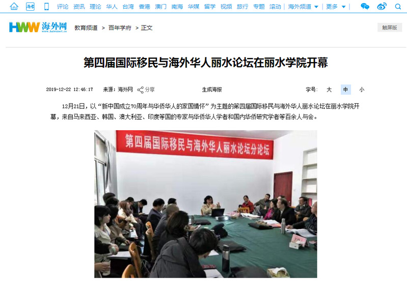 2019年12月22日,海外网报道了第四届国际移民与海外华人丽水论坛在我校举办的消息。