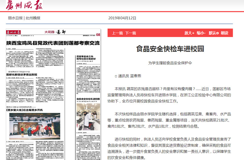 2019年4月12日,处州晚报发布食品安全快检车进校园的消息,我校检查合格。