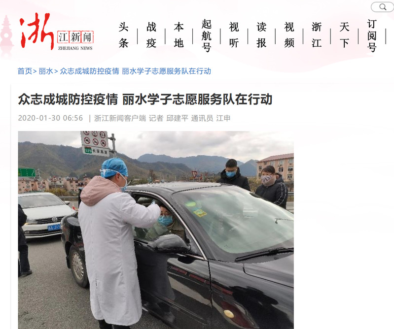 2020年1月30日,浙江新闻客户端发布了我校医学与健康学院学生志愿者在庆元协助开展疫情监测的消息。
