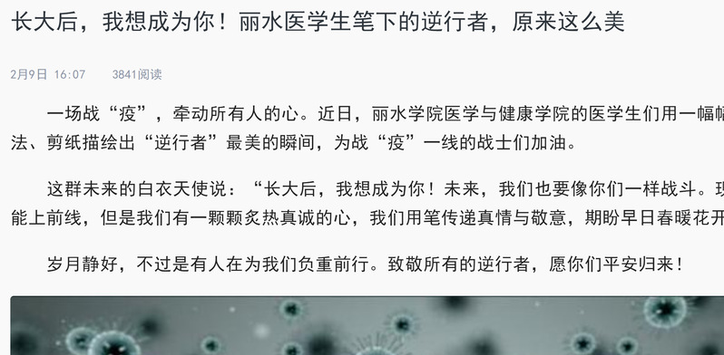 2020年2月9日,指尖丽水APP发布我校医学与健康学院的学子们用图片致敬在战“疫”前线的医护人员的消息。