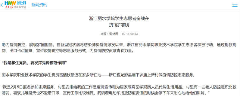 2020年2月14日,人民日报-海外网发布我校职业技术学院学生志愿者奋战在抗“疫”前线的消息。