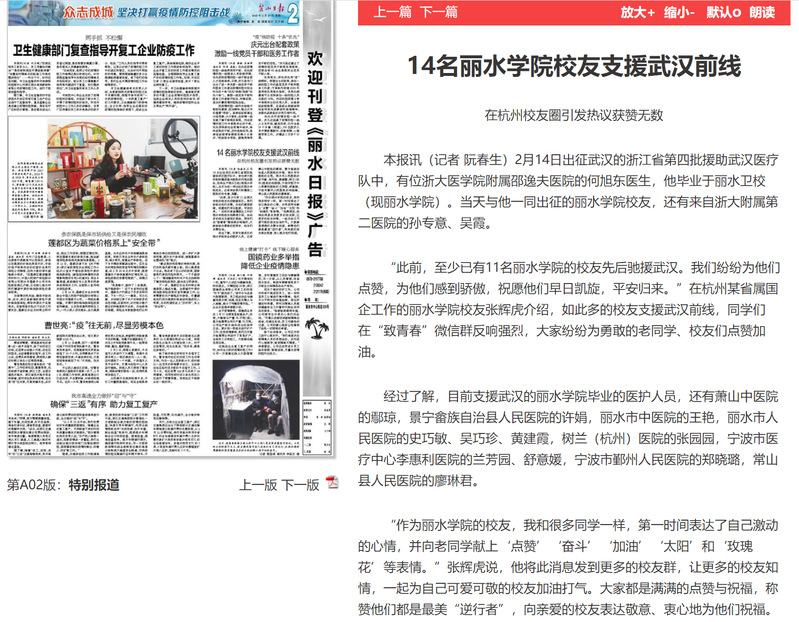 2020年2月17日,丽水日报报道了14名我校校友支援武汉前线的消息。