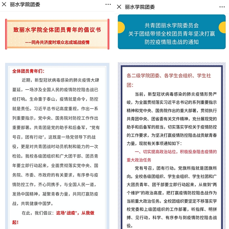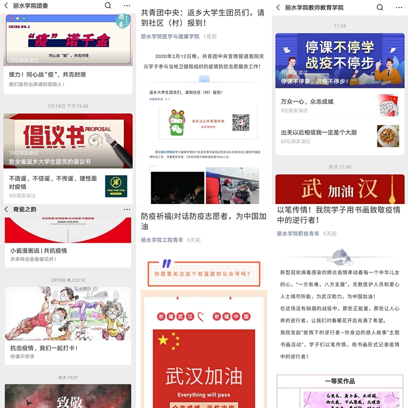 2月1日,校团委发布《致丽水学院全体团员青年的倡议书:同舟共济度时艰 众志成城战疫情》,号召广大团员青年疫情期间服从大局、听从指挥,从我做起、加强防护,善于思考、理性对待,不负韶华、勇于进取。一时间成为我校广大师生朋友圈的热门转发,“同舟共济,共渡难关”、“不信谣!不传谣!听从指挥!”……师生纷纷在倡议书下留言,表达的坚定的信念和必胜的信心。2月8日,校团委发布《共青团丽水学院委员会关于团结带领全校团员青年坚决打赢防控疫情阻击战的通知》,再次受到广大师生中热议,形成了良好的氛围。