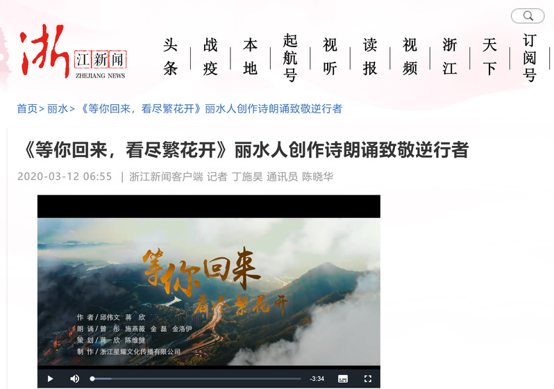 2020年3月12日,浙江新闻发布了《等你回来,看尽繁花开》丽水人创作诗朗诵致敬逆行者消息,我校教师施燕薇参与创作。