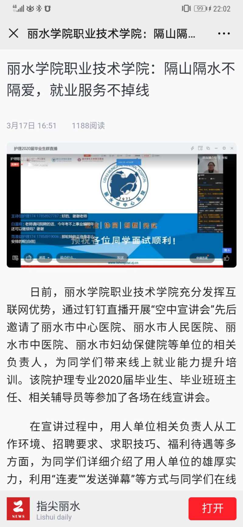 3月17日,丽水日报新闻客户端“指尖丽水”发布了我校职业技术学院在疫情期间,邀请用人单位开展在线宣讲会的报道。