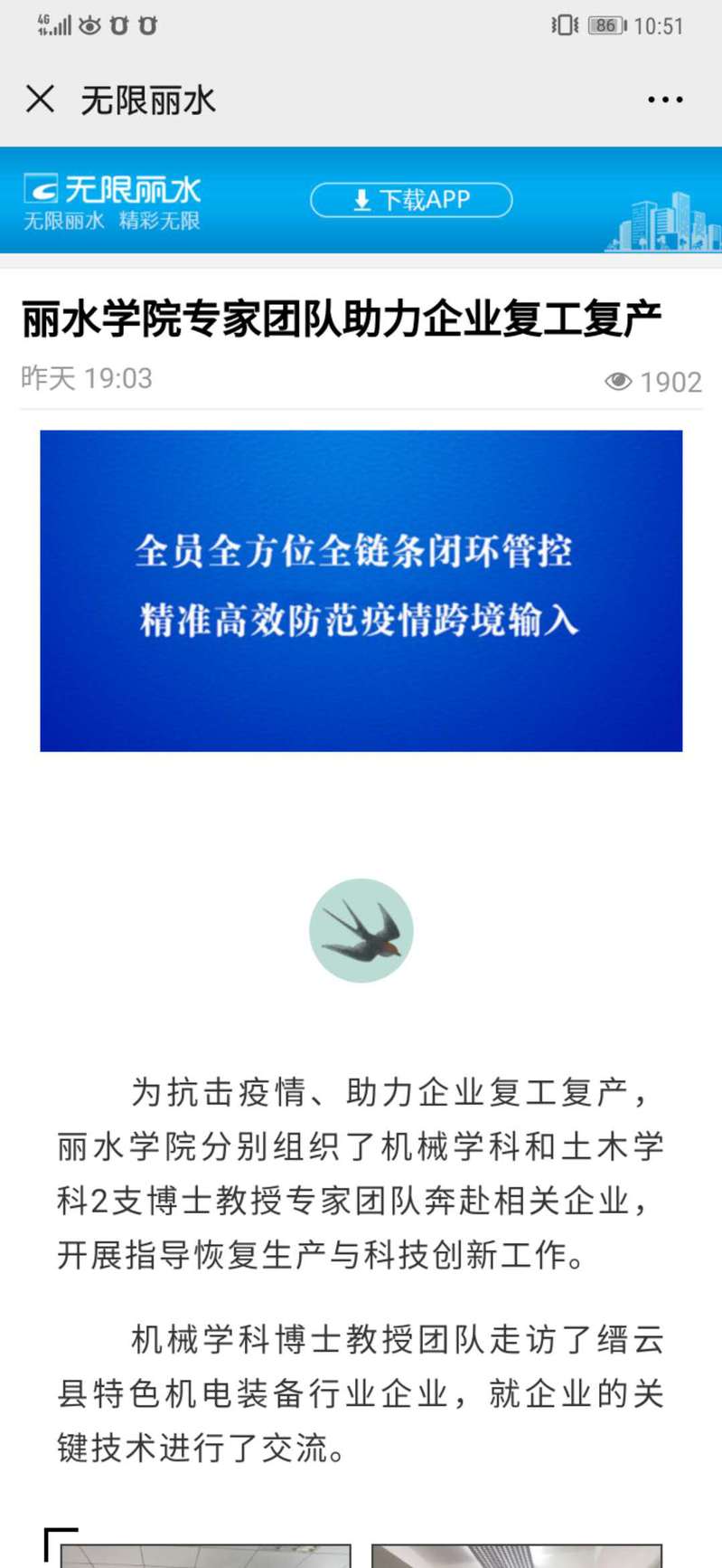 2020年4月2日,无限丽水APP发布我校专家团队助力企业复工复产的消息。