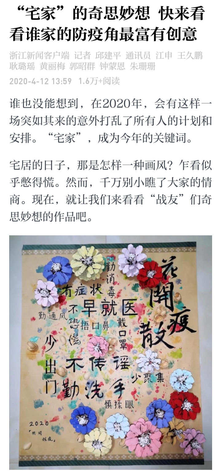 2020年4月12日,浙江新闻客户端报道了我校医学与健康学院万众“医”心战疫情“防疫角”装扮比赛。
