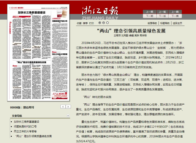 2020年5月11日发行的浙江日报刊发了我校两山学院教师兰菊萍、刘克勤的理论文章《“两山”理念引领高质量绿色发展》。
