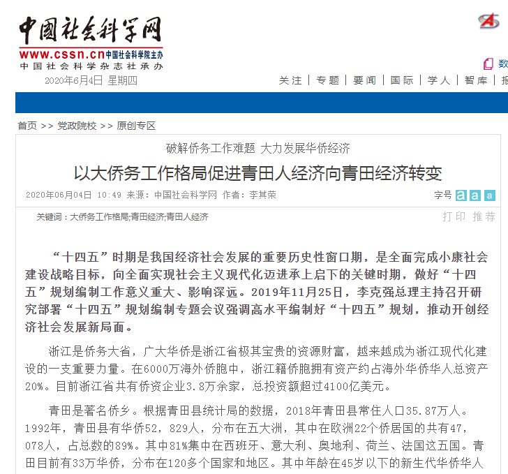 2020年6月4日,中国社会科学网发布了我校华侨学院教授李其荣的理论文章。