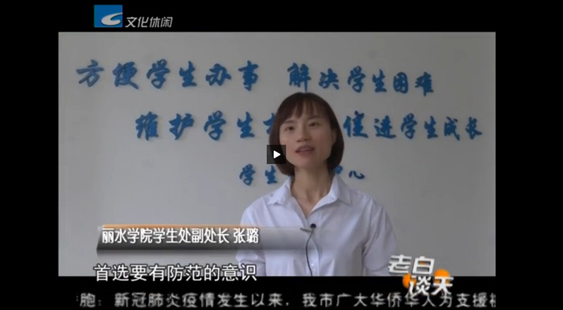 2020年6月8日,丽水电视台文化休闲频道《老白谈天》栏目报道了大学生兼职画画拿不到报酬 老白帮忙去“讨钱”,我校学生处副处长张璐接受采访。