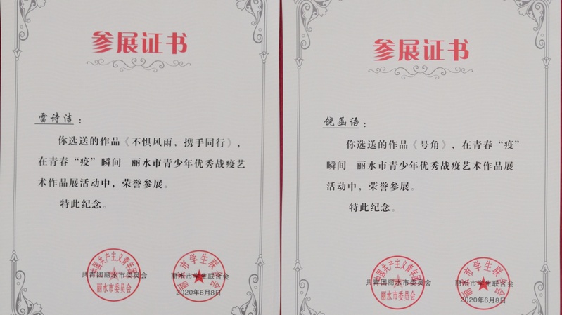 近日,由团市委与市学联主办的线上青春“疫”瞬间文艺作品征集活动圆满落幕,我校雷诗洁同学的作品《不惧风雨,携手同行》、饶函语的作品《号角》入选作品展。