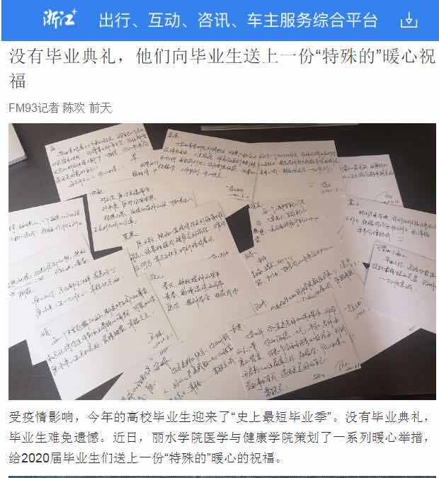 2020年6月19日,浙江电台交通之声APP“浙江+”报道了我校医学与健康学院2020届毕业班辅导员和班主任为毕业生手写明信片送祝福的新闻。