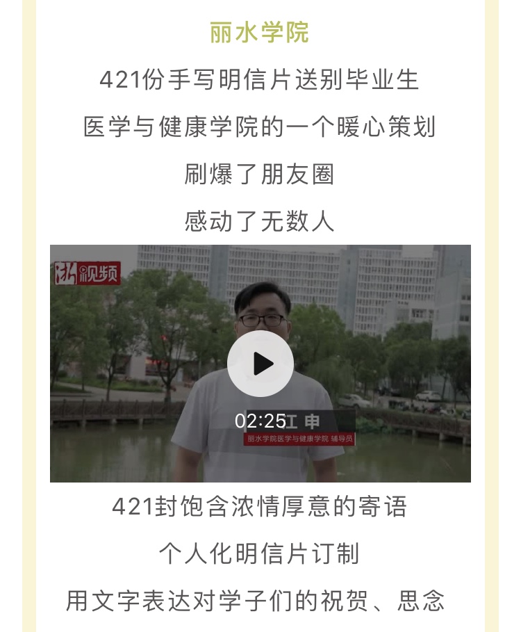 6月29日,浙江省教育厅官方微信公众号“教育之江”报道了我校医学与健康学院2020届毕业生班主任和辅导员为毕业生私人订制明信片的暖心事迹。