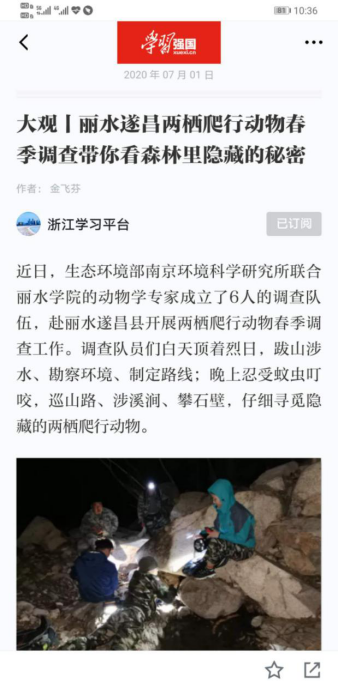 2020年7月1日,学习强国浙江学习平台发布消息,报道了生态环境部南京环科所与我校合作开展丽水生物多样性调查。