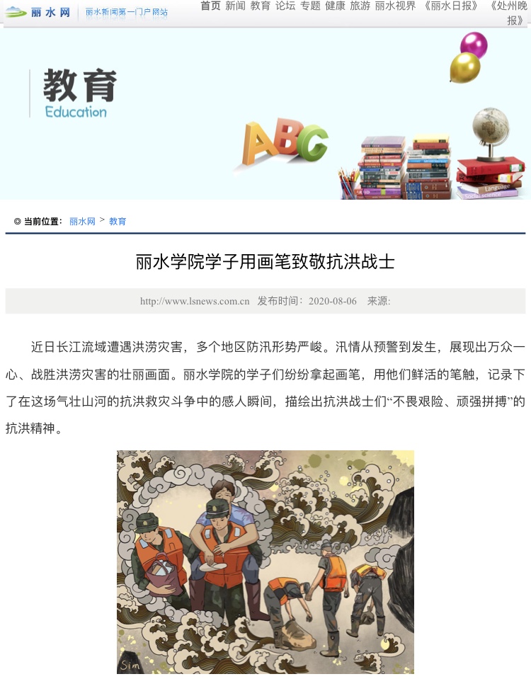 2020年8月6日,丽水网报道了我校医学与健康学院学子用画笔记录抗洪救灾中的感人瞬间,致敬抗洪战士的新闻。
