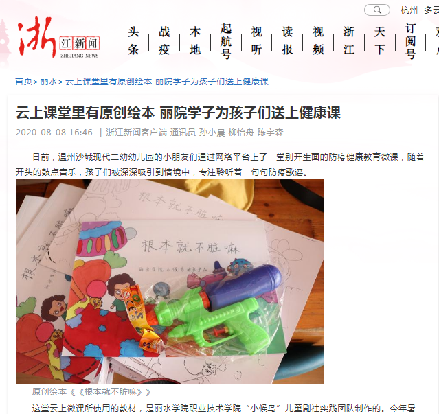 2020年8月8日,浙江新闻客户端报道了我校职业技术学院“小候鸟儿童剧社暑期社会实践团队”的实践故事。