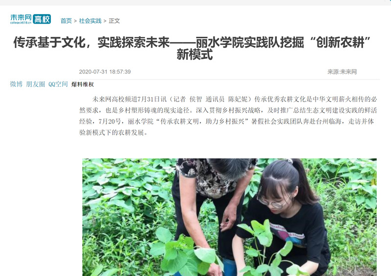 2020年7月31日,全国少工委新媒体——未来网报道了我校生态学院暑假社会实践团队挖掘“创新农耕”新模式的消息。