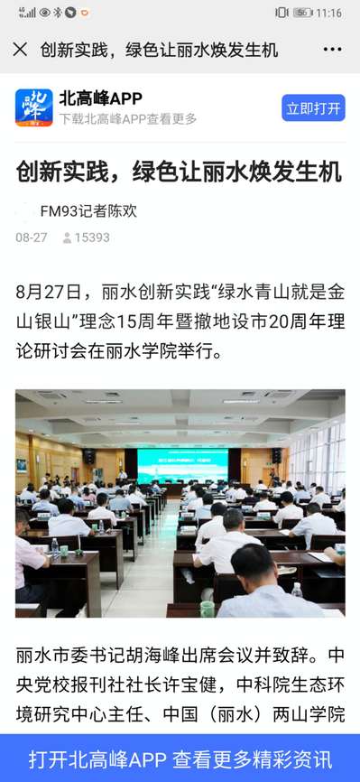 2020年8月28日,FM93客户端北高峰报道了丽水创新实践“绿水青山就是金山银山”理念15周年暨撤地设市20周年理论研讨会在我校举行的消息。