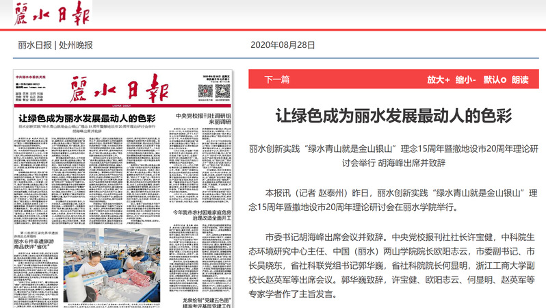 2020年8月28日,丽水日报头版头条报道了丽水创新实践“绿水青山就是金山银山”理念15周年暨撤地设市20周年理论研讨会在我校举行的消息。