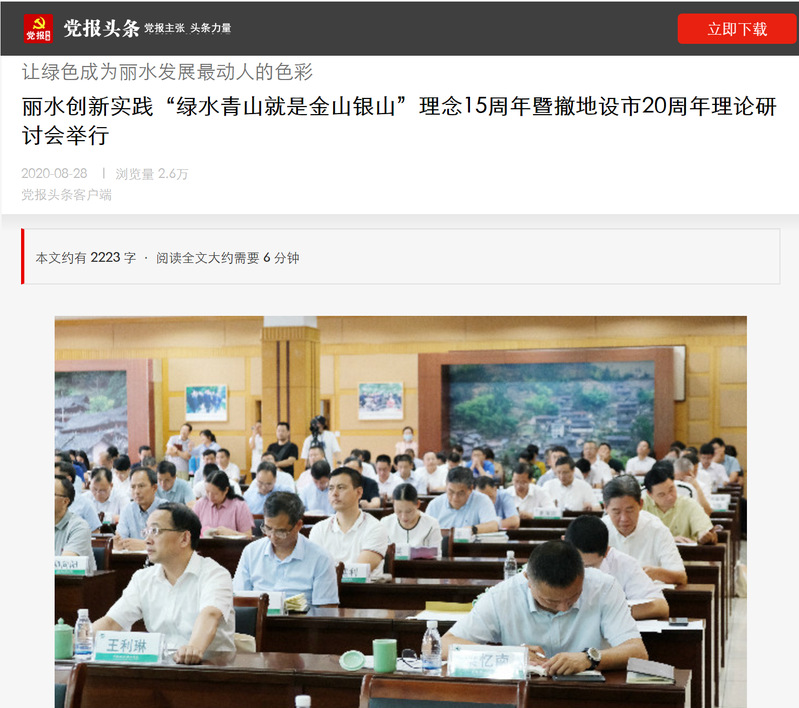 2020年8月28日,党报头条客户端报道了丽水创新实践“绿水青山就是金山银山”理念15周年暨撤地设市20周年理论研讨会在我校举行的消息。
