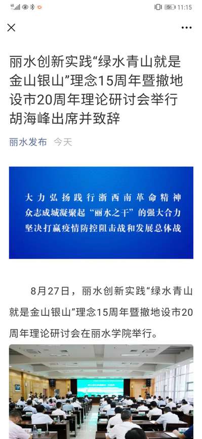 2020年8月28日,丽水发布公众号报道了丽水创新实践“绿水青山就是金山银山”理念15周年暨撤地设市20周年理论研讨会在我校举行的消息。