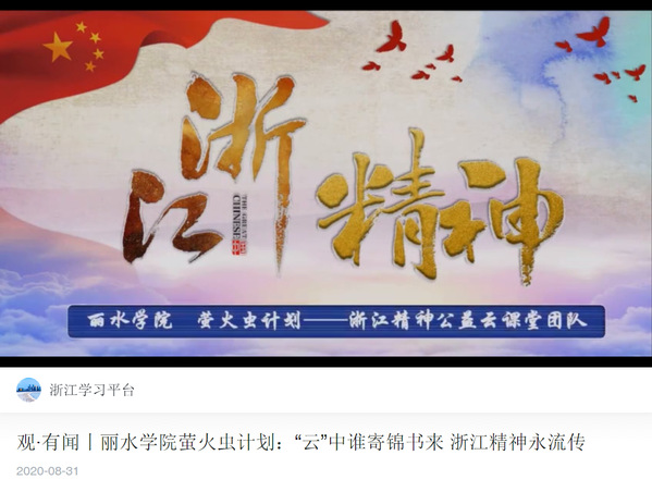 2020年8月31日,学习强国发布了我校“萤火虫计划——浙江精神公益云课堂”团队主动探寻浙江精神,并通过“云”课堂的模式面向浙江乃至全国各地青年学子传播的消息。