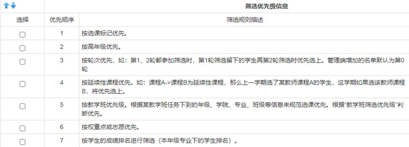 3.3在规定的选课时间内,除配课课程(由系统后台加的,已存在在课表中的课程)不允许退选,自己选择课程可随时退选、补选,选课结束系统自动关闭。主修课程超容量的课程将根据“优先级规则顺序”规则刷掉超出容量的学生。