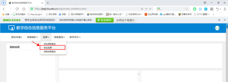 学生使用jwgl.lsu.edu.cn的网址登录系统,用户名与密码与信息门户的一致,登录后使用“选课—自主选课”进行选课操作,如下图。