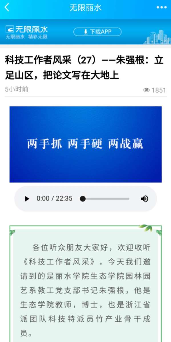 2020年9月8日,无限丽水发布了我校生态学院教师朱强根立足山区,把论文写在大地上的消息。