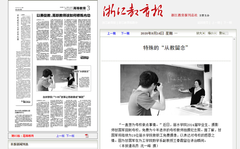2020年9月14日,浙江教育报报道了我校2014届毕业生、摄影师甘国军回到母校,免费为今年退休的母校教师拍摄纪念照的图片新闻。