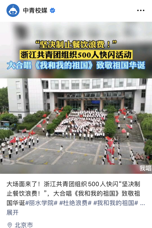 2020年9月28日,中国青年报社旗下短视频账号“中青校媒”发布了“坚决制止餐饮浪费”主题快闪活动在我校举行的短视频。
