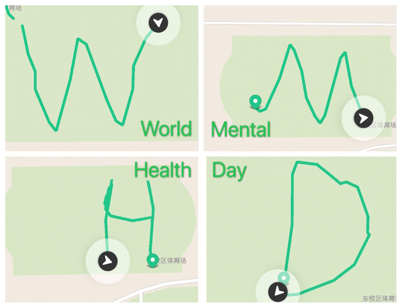 同学们精心设计路线,跑出了专属于世界精神卫生日“WMHD”(World Mental Health Day—世界精神卫生日的英文缩写)和“10.10”(世界精神卫生日的日期)的字母轨迹。活动中,每位同学手腕上都系了一条红色丝巾,寓意勇敢无畏、热情似火。