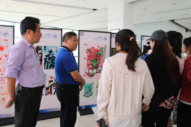 为了进一步加强学校毒品预防教育工作,增强广大学生的禁毒意识及自觉抵 制毒品侵袭的能力,10月10日至10月23日,“全省大学生多媒体设计竞赛优秀禁毒作品巡展”在我校大学生活动中心二楼禁毒角展出,各二级学院纷纷组织学生参观,校党委副书记叶华松到场参观并和同学们进行了交流。