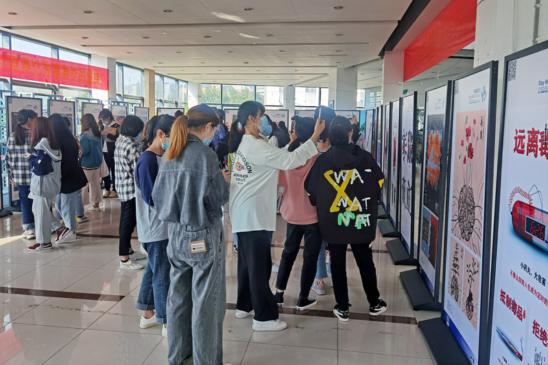本次巡展的作品是在浙江省第18届大学生多媒体设计竞赛中脱颖而出的一等奖海报。作品构思精巧、寓意深刻,展现了当代青年学生对毒品危害的深刻认识以及不断增强的禁毒意识。除此之外,禁毒角的展示柜里陈列了14种常见的毒品,加深了学生对毒品的直观认识。