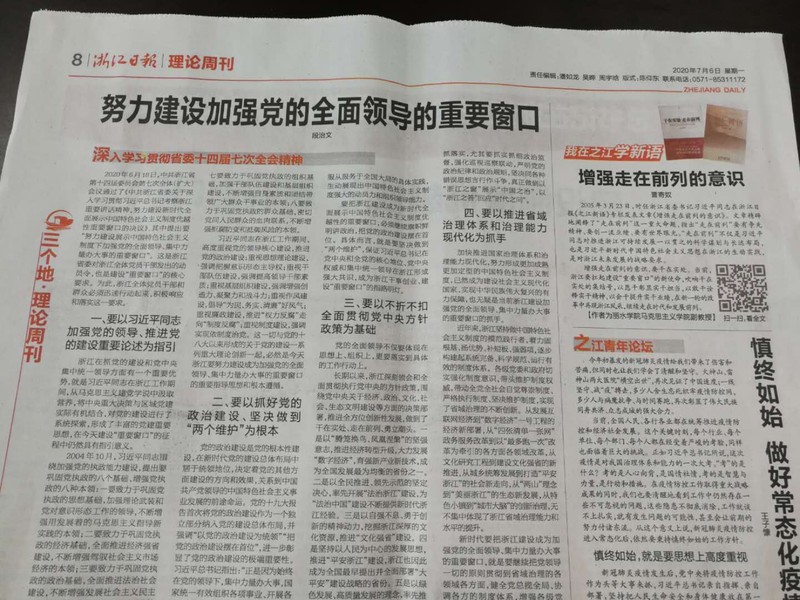 2020年7月6日,浙江日报理论周刊版刊登了我校马克思主义学院教师曹寄奴老师的理论文章《增强走在前列的意识》。
