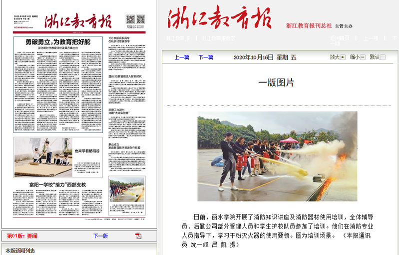 2020年10月16日,浙江教育报报道了我校开展了消防知识讲座及消防器材使用培训的图片新闻。